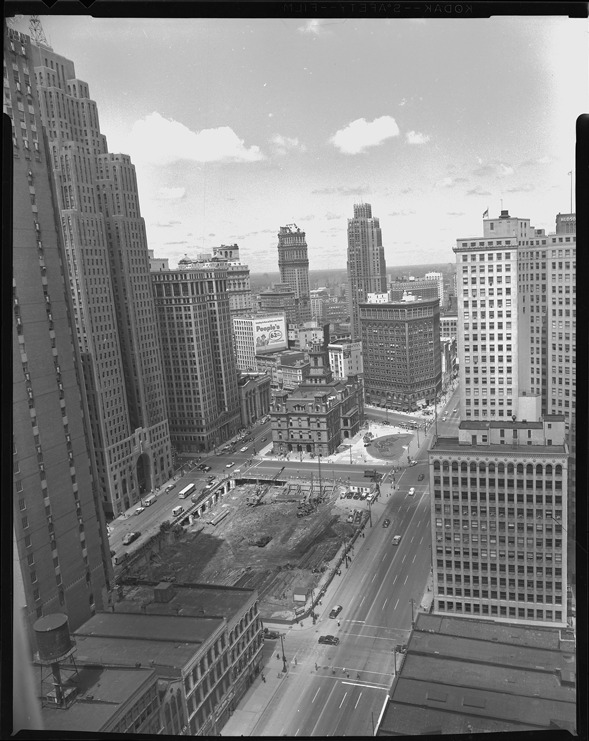 Bird's-eye view of the construction site for the National Bank of Detroit building, surrounded by office buildings.