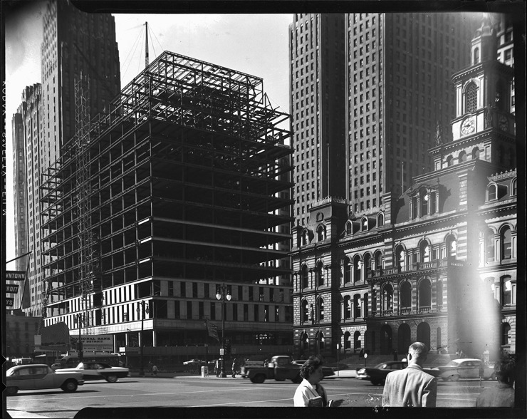 Favorite this☆ National Bank of Detroit building during construction Description: View of the National Bank of Detroit building during construction, surrounded by office buildings. Traffic in street. Details Resource ID: bh019620 Subject: Bank buildings--Michigan--Detroit--Design and construction National Bank of Detroit Automobiles--Michigan--Detroit Office buildings--Michigan--Detroit Detroit Housing Commission--Archives Photography--Negatives Date Issued: 1957 Format: 1 negative ; 4 x 5 in. Member of: Burton Historical Collection Filing Location: MS/Detroit Archives. Housing Commission. National Bank building, 1957. 57:20 Rights: Physical rights are retained by DPL. Copyright is retained in accordance with U.S. copyright laws.