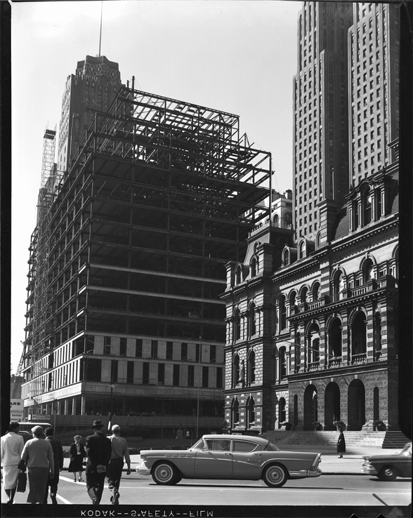 Favorite this☆ National Bank of Detroit building during construction Description: View of the National Bank of Detroit building during construction, surrounded by office buildings. Car and pedestrians in foreground. Details Resource ID: bh019621 Subject: Bank buildings--Michigan--Detroit--Design and construction National Bank of Detroit Automobiles--Michigan--Detroit Detroit Housing Commission--Archives Photography--Negatives Date Issued: 1957 Format: 1 negative ; 5 x 4 in. Member of: Burton Historical Collection Filing Location: MS/Detroit Archives. Housing Commission. National Bank building, 1957. 57:20 Rights: Physical rights are retained by DPL. Copyright is retained in accordance with U.S. copyright laws.