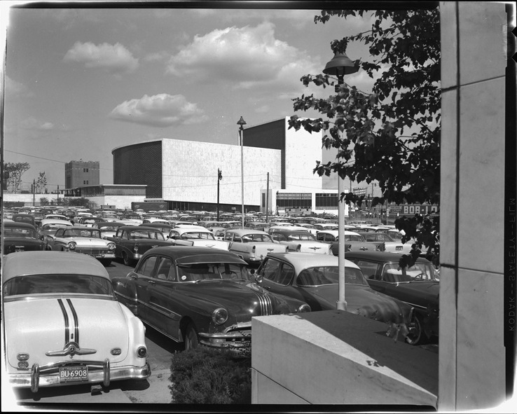 View of Ford Auditorium. Cars in parking lot in foreground.