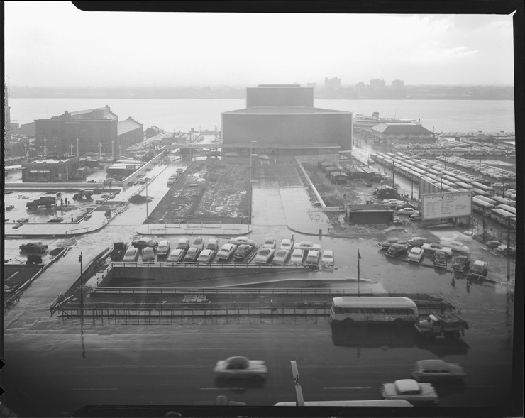 Bird's-eye view of Ford Auditorium, with Jefferson Ave. in foreground.