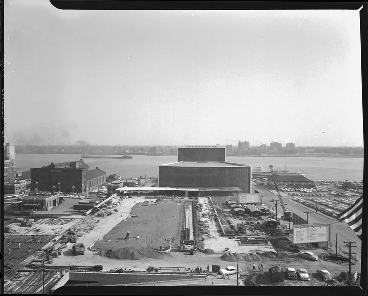 Bird's-eye view of Ford Auditorium, with construction site in foreground.