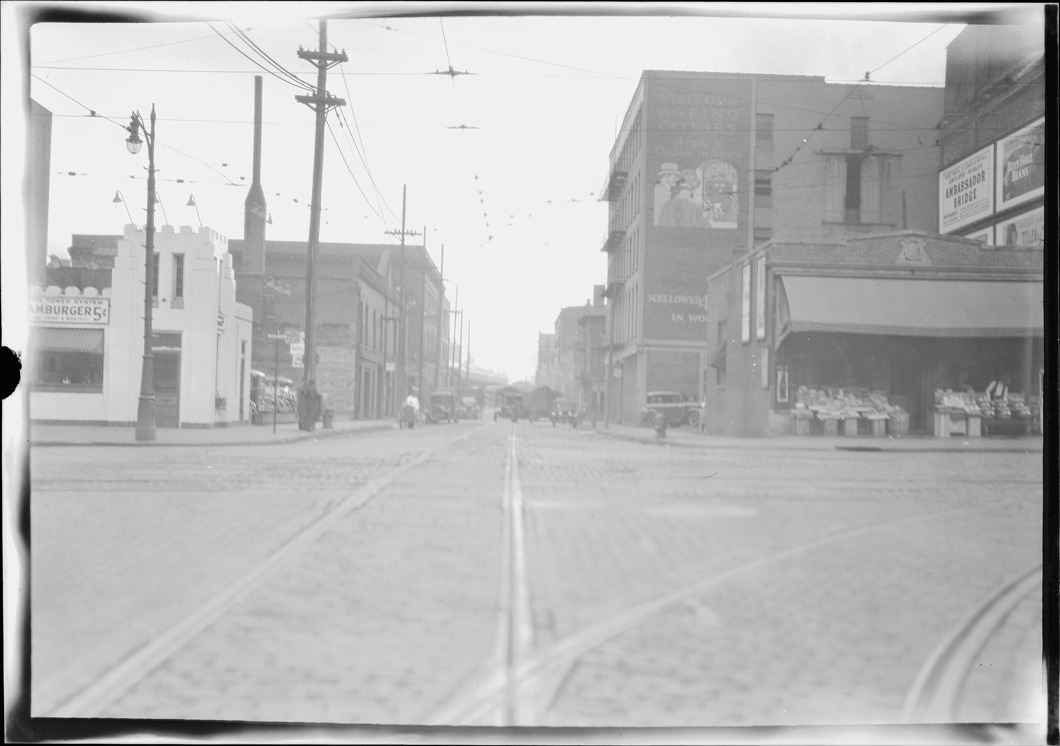 View of commercial buildings along Atwater St., west from Woodward Ave.