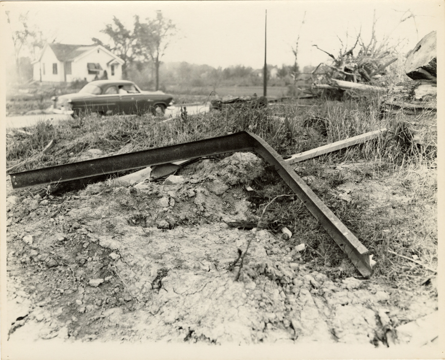 Close-up view of debris left by tornado that touched down in Beecher, a community near Flint, Michigan. House and automobile in background. The tornado, which struck Genesee County, Michigan on June 8, 1953, is considered to be one of the deadliest tornadoes in U.S. history.