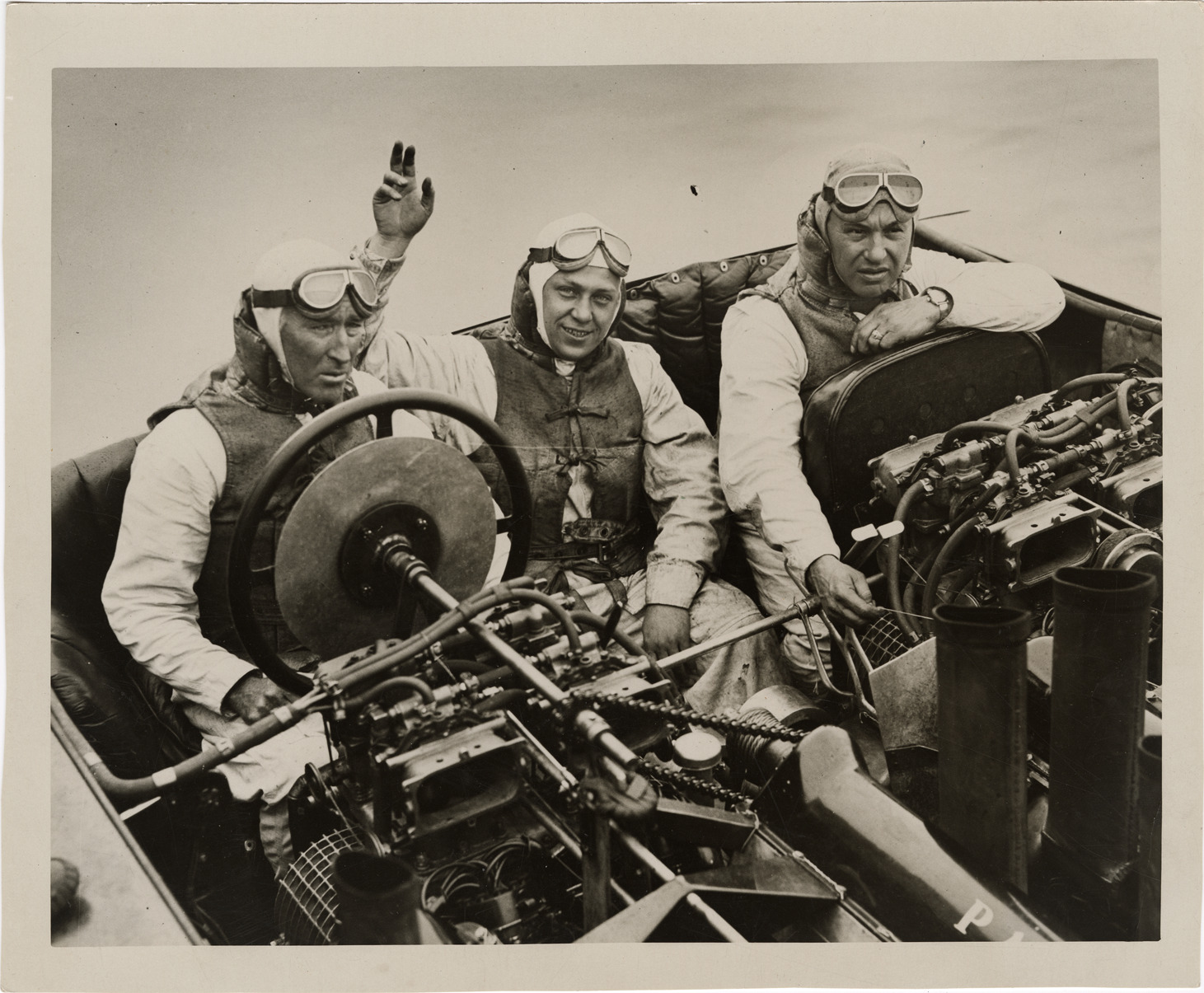 View of Gar Wood, Bud Shaver and Orlin Johnson posing in the motorboat "Miss America X," possibly during the 1932 Harmsworth Trophy Race. Handwritten on back: "L to R. Gar Wood, Bud Shaver, Orlin Johnson. 'Miss America' 100 miles/hr. Probably 1932 Harmsworth."