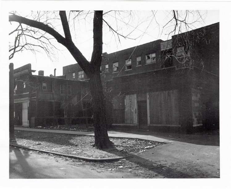 Rear of an abandoned brick commercial building located at 1500-1508 Pallister on the corner of Poe. Stamped on back: "Photography by D. Bruce Banta, Detroit." Handwritten on back: "1500-08 Pallister, 7721 Poe. Parcels 68 and 69."