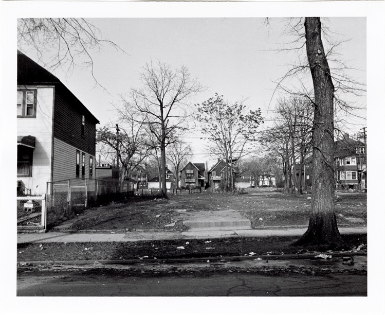 View of a vacant lot located at 1420 Pallister. Houses in background. Stamped on back: "Photography by D. Bruce Banta, Detroit." Handwritten on back: "1420 Pallister. Parcel 70."