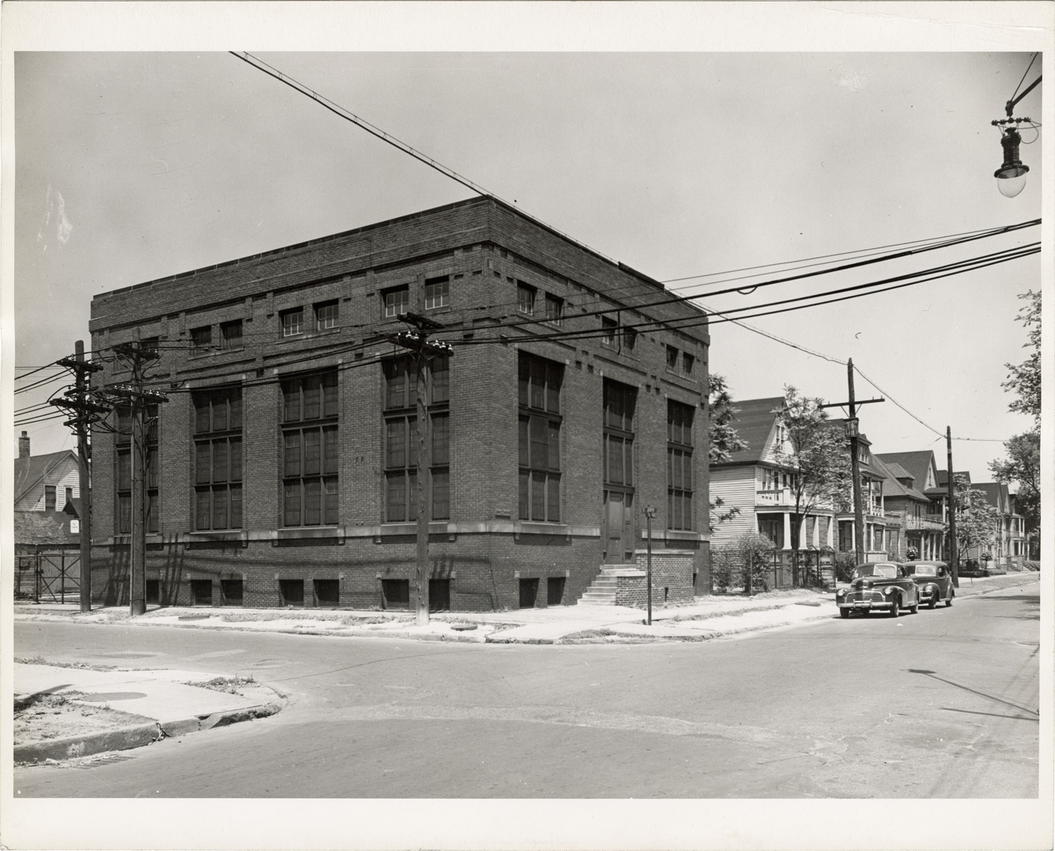 View of the Trombley railway substation located at Dubois and Trombley Avenues. Cars are parked in street; houses in background. Stamped on back: "Photograph by Harold Raymond. No. CC9." Handwritten on back: "P.L.C. Dubois & Trombley. Trombly [sic] railway substation."