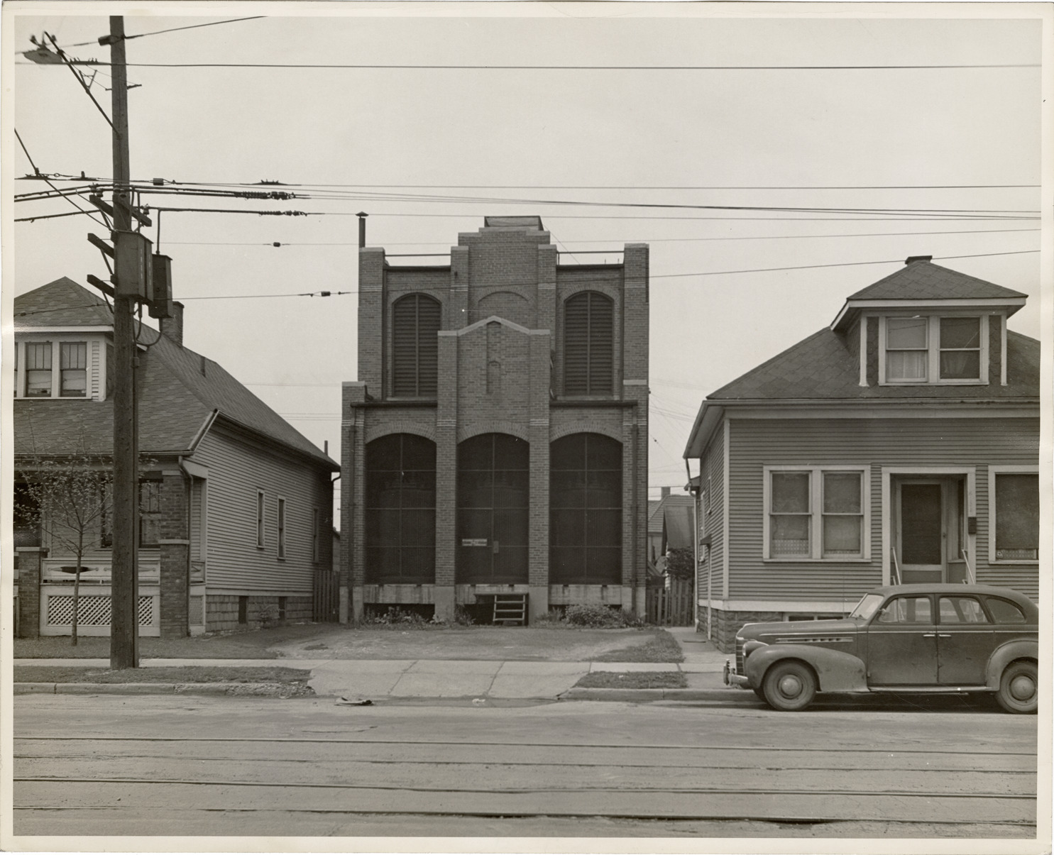 View of the Wyoming railway substation located at Wyoming and Michigan Avenue, between two wooden-frame houses. Car is parked in street. Stamped on back: "Photograph by Harold Raymond. No. AP8." Handwritten on back: "P.L.C. Wyoming & Michigan. Wyoming railway substation."