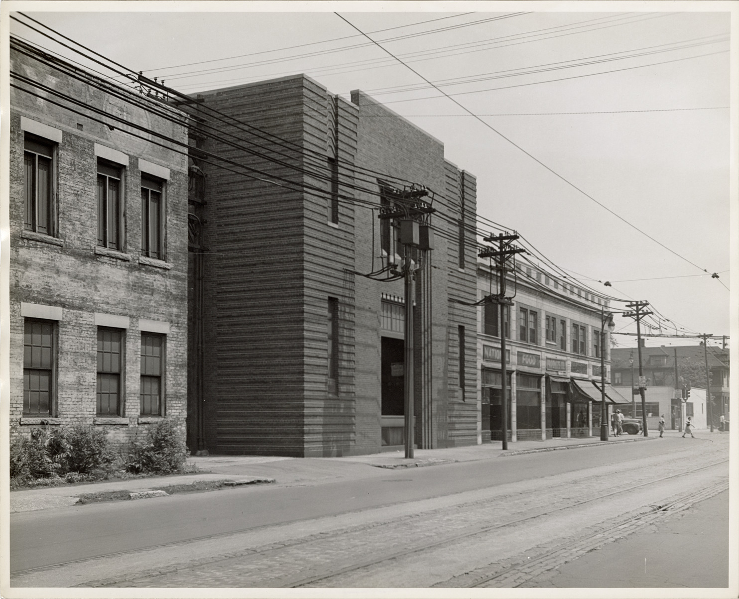 View of the Warren railway substation located at Warren Avenue and 14th Street. Stamped on back: "Photograph by Harold Raymond. No. AP7." Handwritten on back: "P.L.C. Warren & 14th. Warren railway substation."