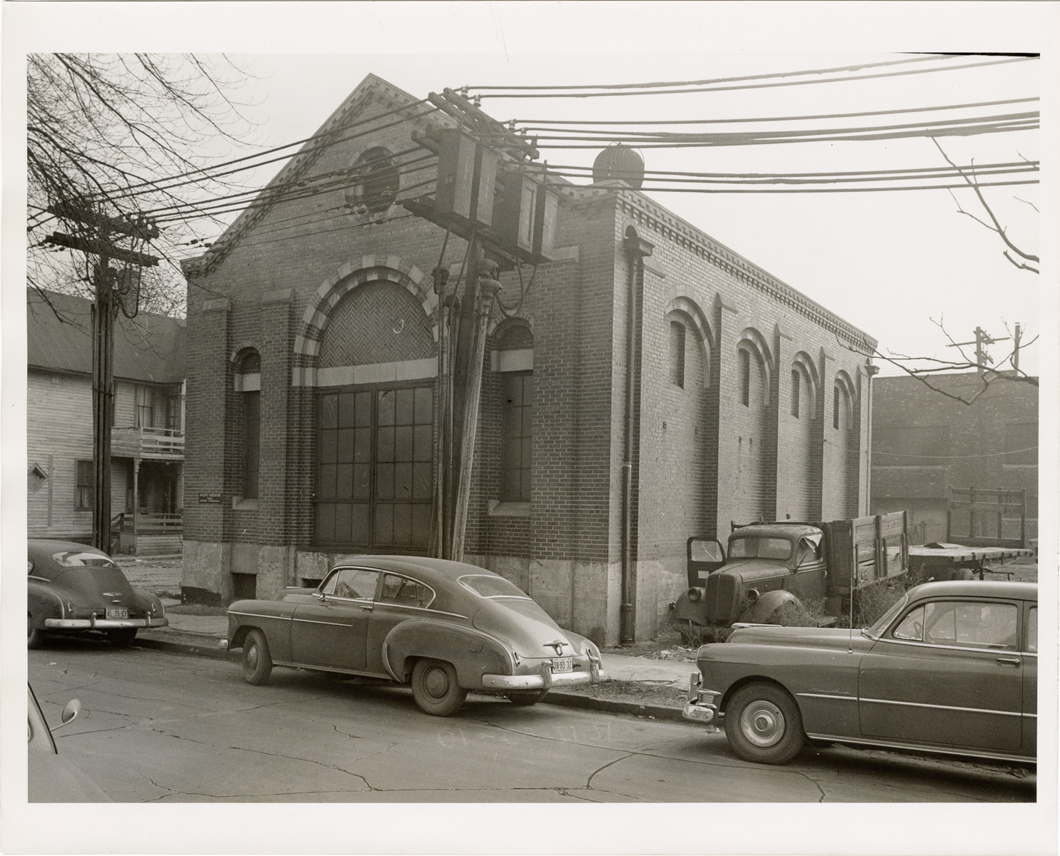 View of the Mullett lighting substation located on Mullett Street, east of Rivard Street. Cars are parked in street; truck is parked adjacent to building. Stamped on back: "Photograph by Harold Raymond." Handwritten on back: "P.L.C. Mullett sub-station. S.S. Mullett St., E. of Rivard."