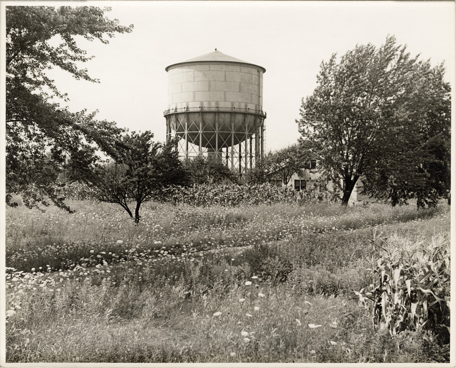 View of the Northwestern water tower, located at Trojan and Forrer. Stamped on back: "Detroit City Plan Commission. Photograph by Harold Raymond. No. AS8." Handwritten on back: "Northwestern tank site. Trojan & Forrer."