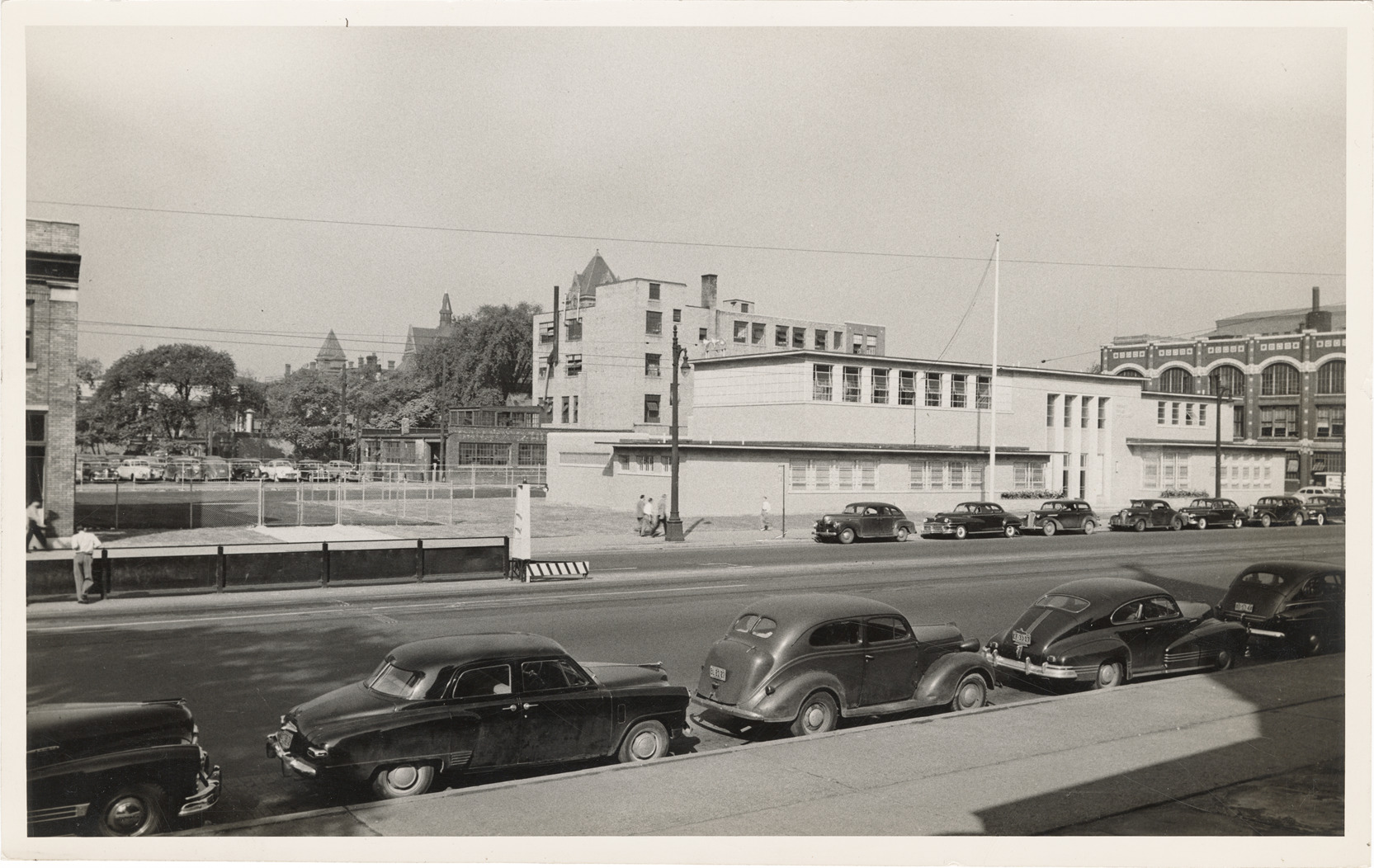 View of the Detroit Police Department, Third Precinct station, located on Woodward Avenue at Canfield. Cars are parked in street.