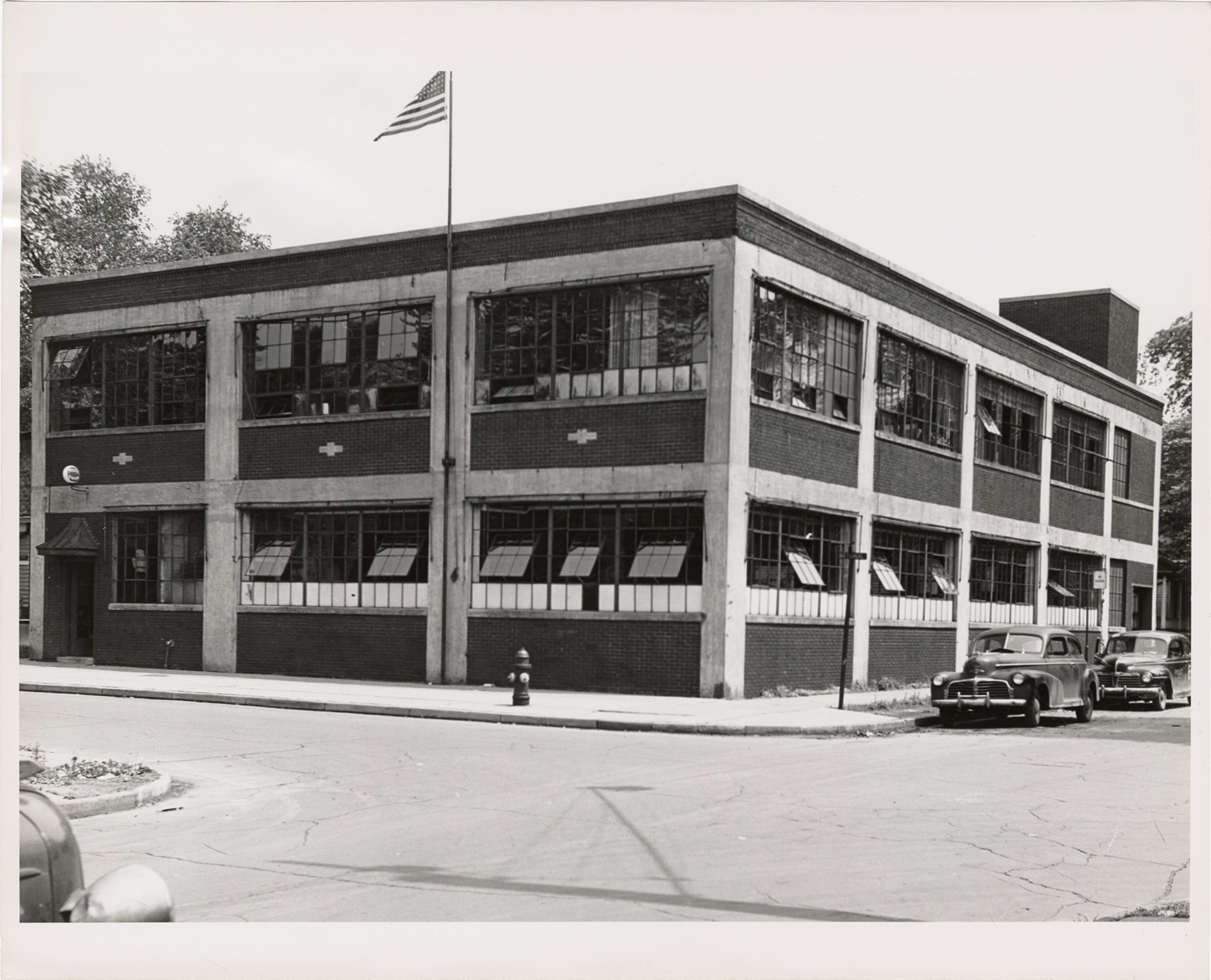 View of the Detroit Police Department station located at Pine and National. Cars are parked adjacent to building. Stamped on back: "Detroit City Plan Commission. Photograph by Harold Raymond. No. AP6." Handwritten on back: "Police station, Pine & National. 6-28-45."