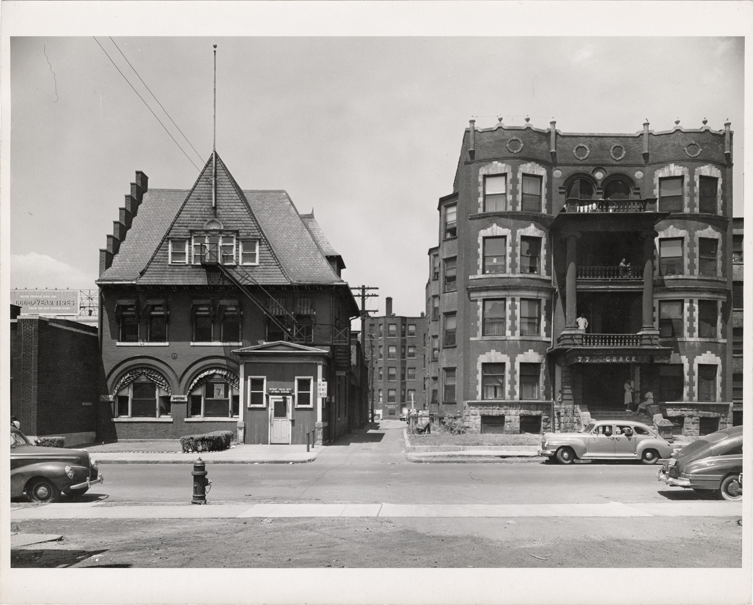 View of the Detroit Police Department, Thirteenth Precinct station, located on Canfield, east of Woodward Avenue. Car is parked in front of adjacent apartment building. Stamped on back: "Detroit City Plan Commission. Photograph by Harold Raymond. No. CC7." Handwritten on back: "Police, 13th Precinct. N.S. Canfield, E. of Woodward. 6-23-45."