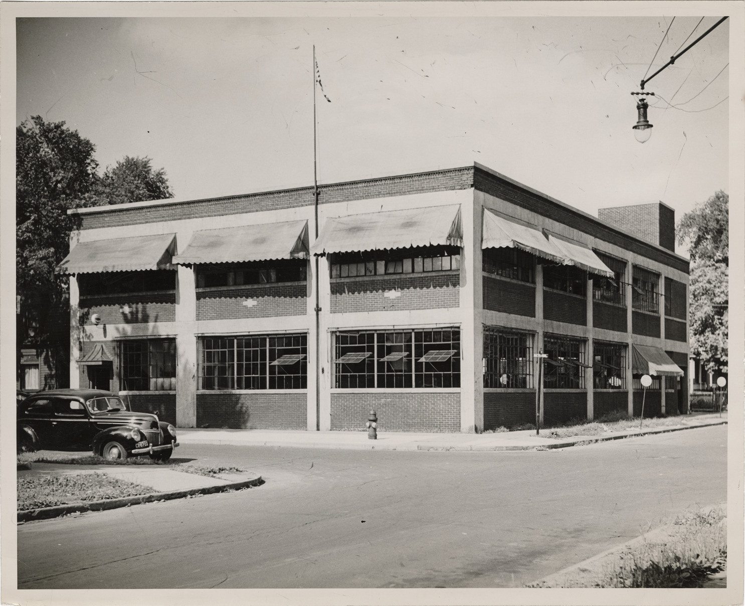 View of the Detroit Police Department station located at Pine and National. Car is parked at corner. Stamped on back: "Detroit City Plan Commission. Photograph by Harold Raymond." Handwritten on back: "Public bldgs. Police station at Pine & National. Raymond, 1944."