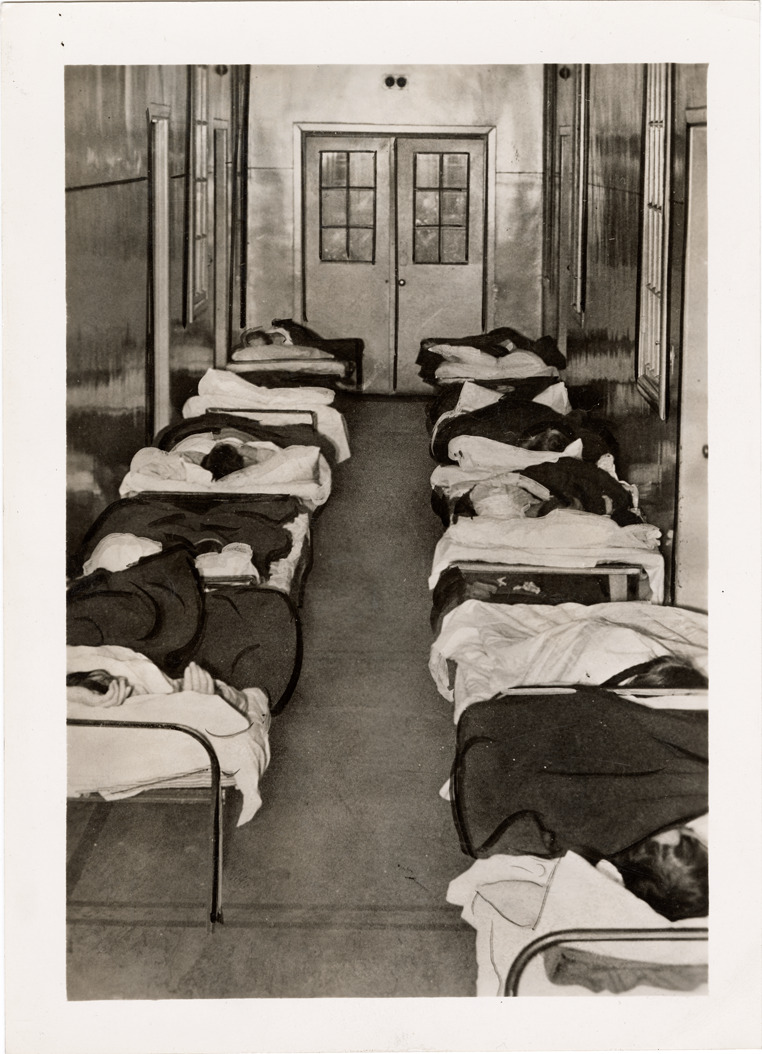 View of patients resting on cots in a narrow hallway of an unidentified medical facility.