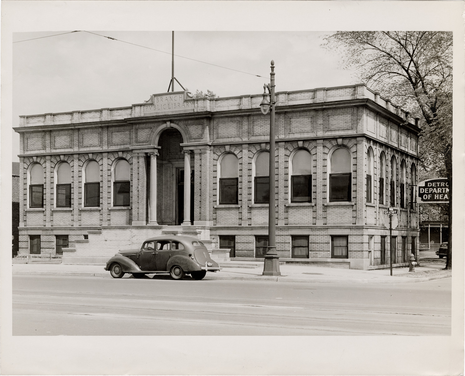 View of a car parked in front of the Gratiot Avenue Health and Teaching Center, Detroit Department of Health. Brick building has "Branch, Public Library" inscribed over doorway; Detroit Department of Health sign on right. Stamped on back: "Detroit City Plan Commission. Photograph by Harold Raymond. No. CA18." Handwritten on back: "Gratiot Ave. Health and Teaching Center. Gratiot and Pulford."