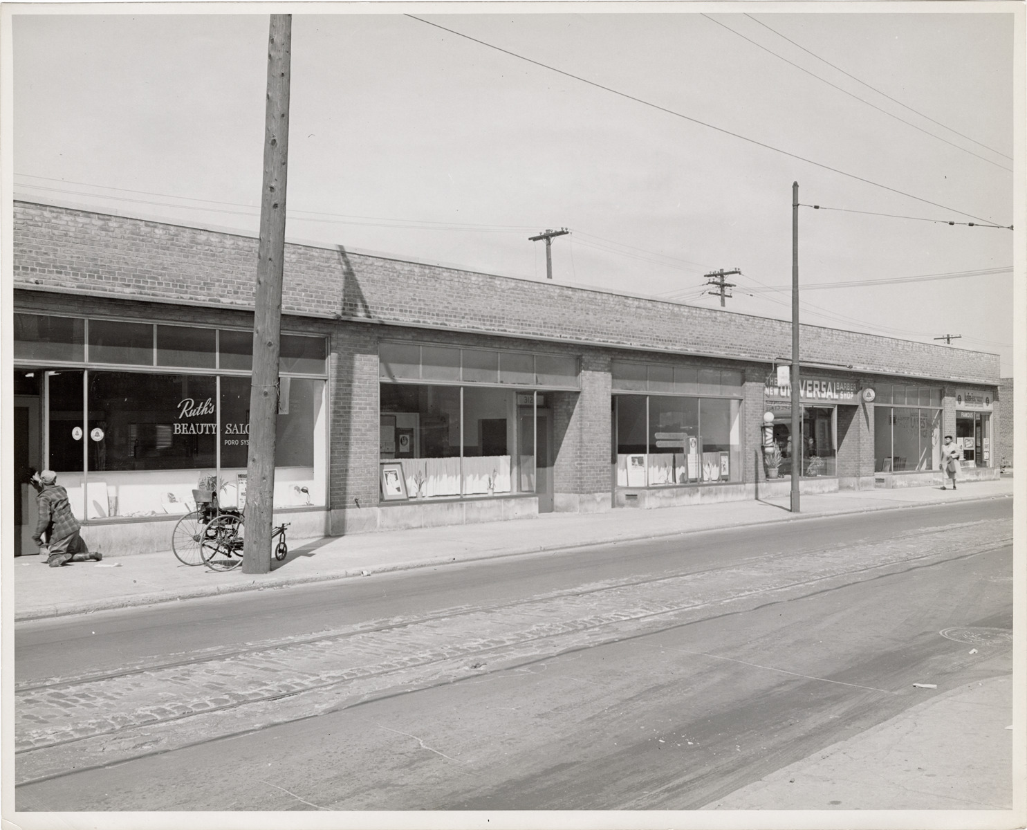 View of several storefronts on Hastings and Watson, possibly the site of the Brewster X-ray health clinic. Wheelchair on sidewalk; kneeling man rings doorbell. "Ruth's beauty salon" is painted in window; the New Universal barbershop in background. Stamped on back: "Detroit City Plan Commission. Photograph by Harold Raymond. No. CB20." Handwritten on back: "Health Clinic (Brewster X-ray), Hastings & Watson."