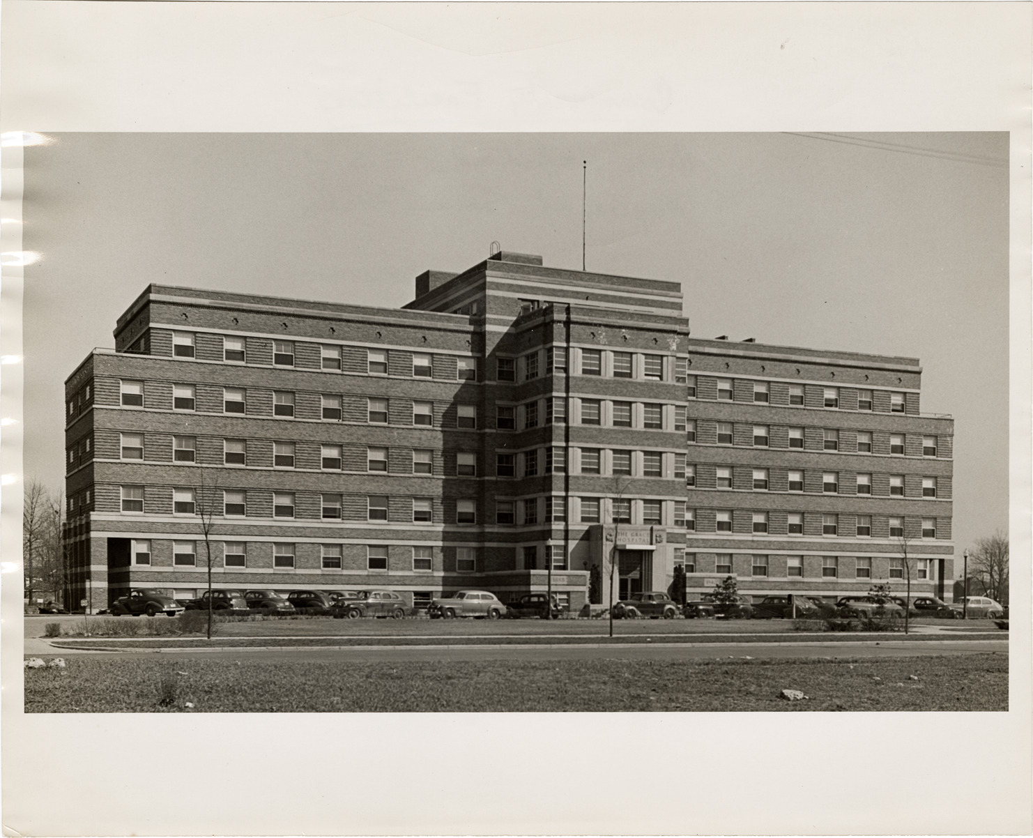 View of Grace Hospital, located at Meyers and 7 Mile Road. Stamped on back: "Detroit City Plan Commission. Photograph by Harold Raymond. No. AJ5." Handwritten on back: "Community facilities. Grace Hospital, E.S. of Meyers at Seven Mile. 3-27-45."
