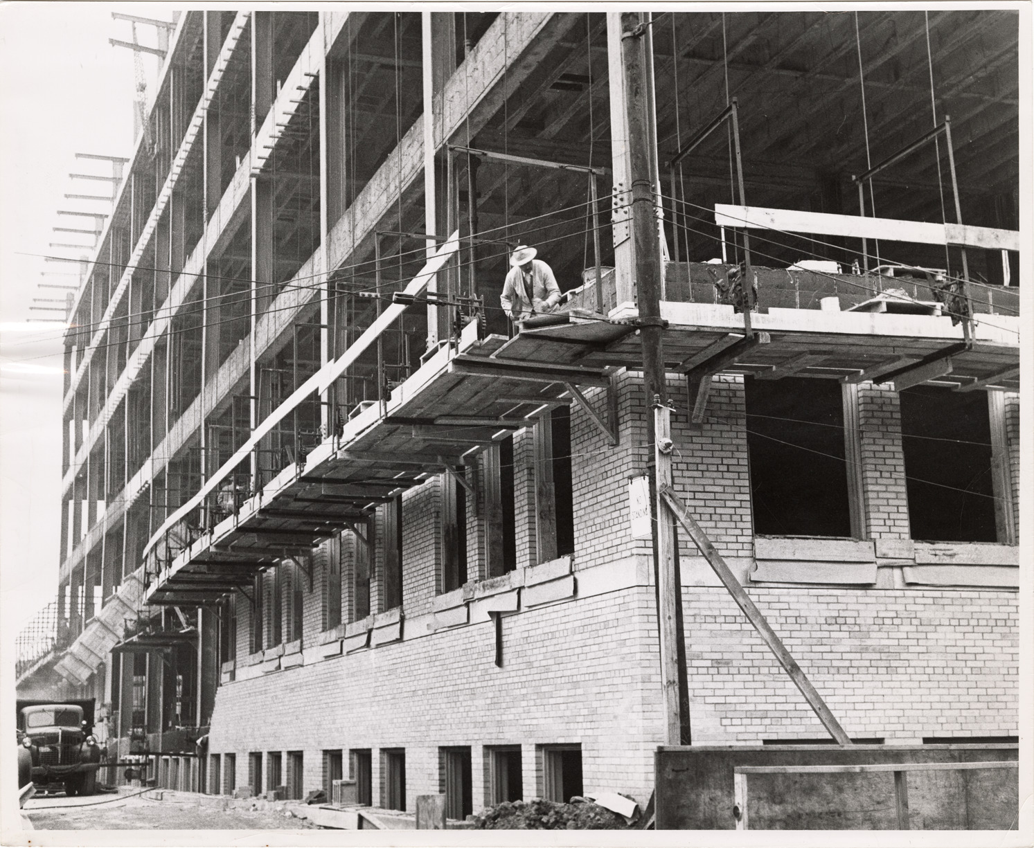 Favorite this☆ Bricklayer working on addition, Detroit Receiving Hospital Description: View of bricklayer working on an addition for the Detroit Receiving Hospital. Typed on back: "Receiving Hospital addition. Picture taken 10/25/50." Details Resource ID: bh020057 Subject: Hospital buildings--Michigan--Detroit--Design and construction Detroit Receiving Hospital Buildings--Additions--Michigan--Detroit--Design and construction Bricklayers--Michigan--Detroit Bricklaying--Michigan--Detroit Detroit Housing Commission--Archives Photographic prints Date Issued: 1950-10-25 Format: 1 photographic print ; 8 x 10 in. Member of: Burton Historical Collection Filing Location: MS/Detroit Archives. Housing Commission. Health centers and hospitals. 60:11 Rights: Physical rights are retained by DPL. Copyright is retained in accordance with U.S. copyright laws.