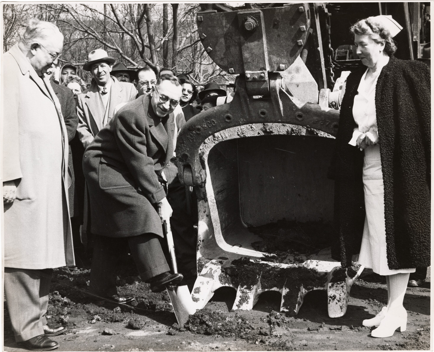 View of Detroit mayor Albert E. Cobo posing with shovel at groundbreaking ceremony for the new addition of Detroit Receiving Hospital. Woman in nurse's uniform, possibly Marie Wooders, stands on right. Handwritten on back: "Ground breaking, April 7, 1950."
