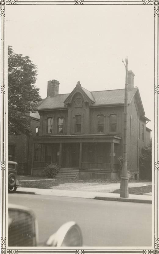 View of a two-story brick house with covered entry porch, located on Canfield Ave. Handwritten in scrapbook: "Canfield Ave."