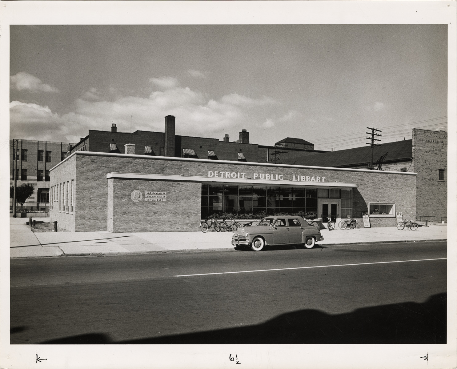 View of the Franklin Branch Library, Detroit Public Library. Car is parked in street. Stamped on back: "Detroit City Plan Commission. Photograph by Harold Raymond." Handwritten on back: "Benjamin Franklin Library, completed, in use. Schoenherr & McNichols Rd."