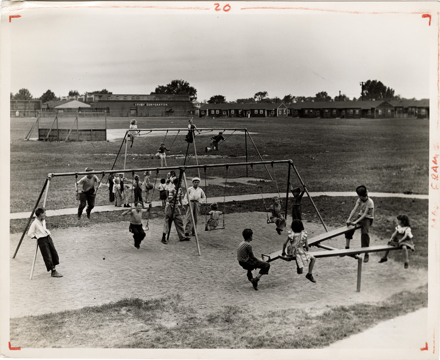 Favorite this☆ Children in playground at Emerson Homes Description: View of boys and girls in playground at the Emerson Homes public housing development. Residential buildings in background. Handwritten on back: "Emerson Homes." Details Resource ID: bh020114 Creator: Raymond, Harold Subject: Playgrounds--Michigan--Detroit Children--Michigan--Detroit Public housing--Michigan--Detroit Low-income housing--Michigan--Detroit Dwellings--Michigan--Detroit Detroit Housing Commission--Archives Photographic prints Date Issued: Unknown year Format: 1 photographic print ; 8 x 10 in. Member of: Burton Historical Collection Filing Location: MS/Detroit Archives. Housing Commission. Miscellaneous neighborhoods. 60:15 Rights: Physical rights are retained by DPL. Copyright is retained in accordance with U.S. copyright laws.