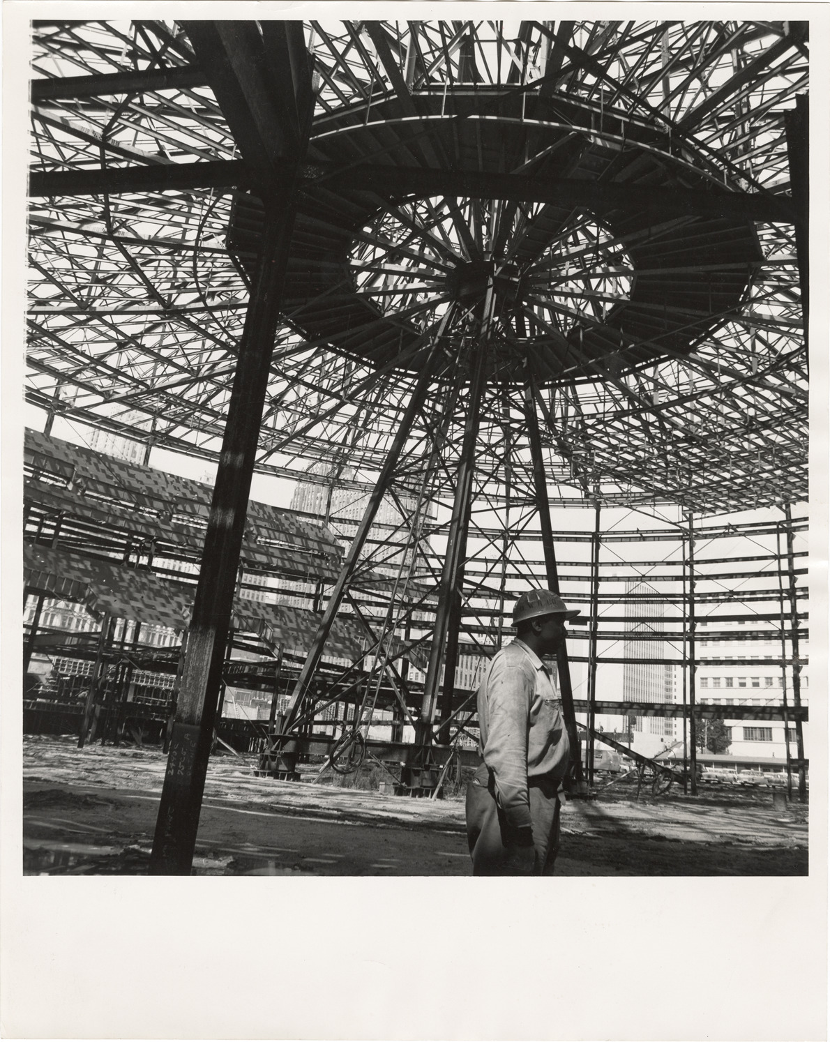 View of a construction worker inside the structural framework of the parking structure for Cobo Hall. Stamped on back: "Taylor. Date: [blank]. Location: [blank]. City Plan Commission."