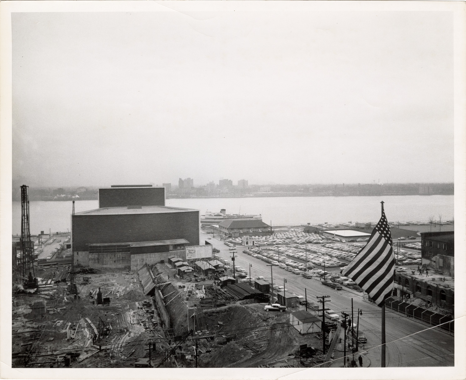 View of a construction site in front of Ford Auditorium. Cars in parking lot on right; Detroit River in background.