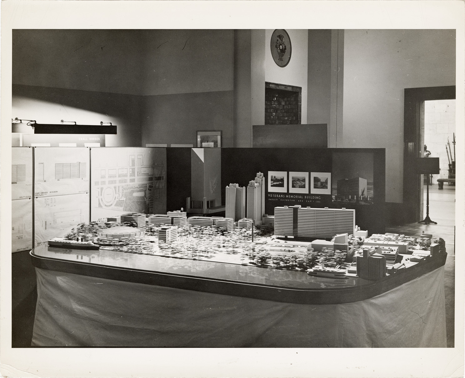 View of an architectural model for the Detroit Civic Center. Stamped on back: "Photograph by Harold Raymond. No. 2-16-49."