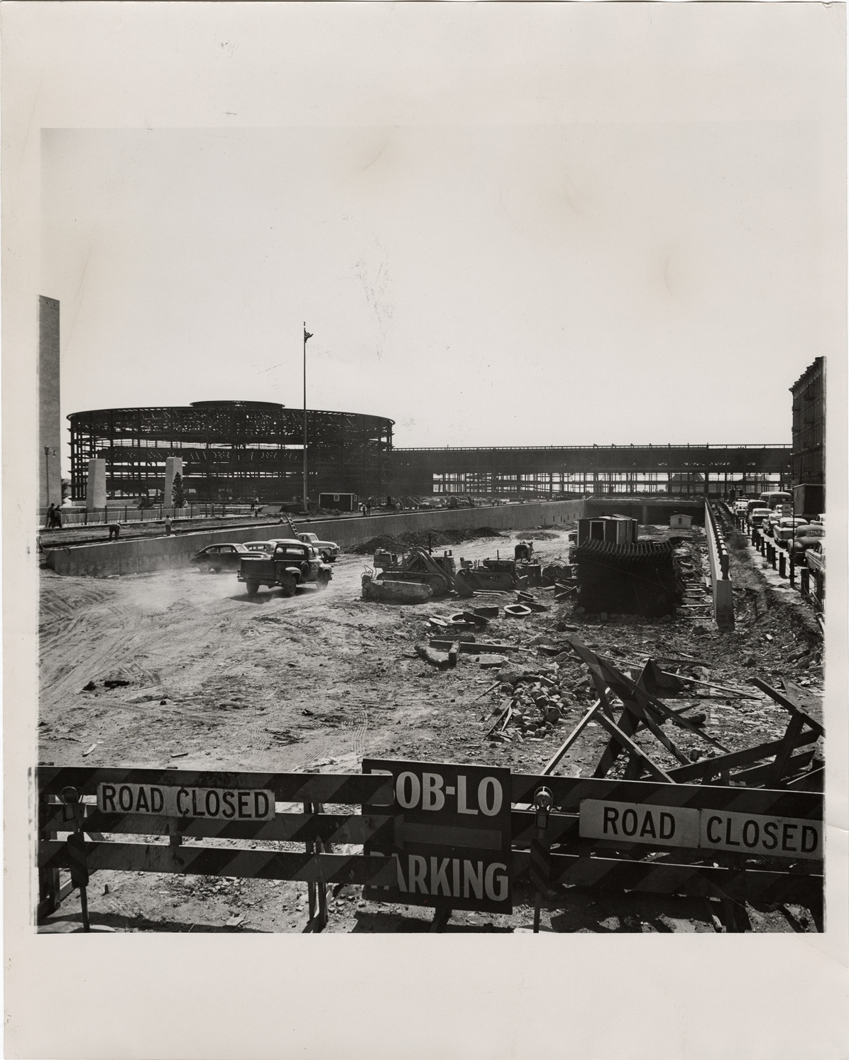 Favorite this☆ Construction site on Detroit riverfront Description: View of a construction site on the Detroit riverfront. Construction debris with "Bob-Lo parking" and "Road closed" signs in foreground; parking structure for Cobo Hall in background. Details Resource ID: bh020139 Subject: Building sites--Michigan--Detroit Parking garages--Michigan--Detroit--Design and construction Construction and demolition debris--Michigan--Detroit Detroit Housing Commission--Archives Photographic prints Date Issued: Unknown year Format: 1 photographic print ; 10 x 8 in. Member of: Burton Historical Collection Filing Location: MS/Detroit Archives. Housing Commission. Civic Center. 60:19 Rights: Physical rights are retained by DPL. Copyright is retained in accordance with U.S. copyright laws.