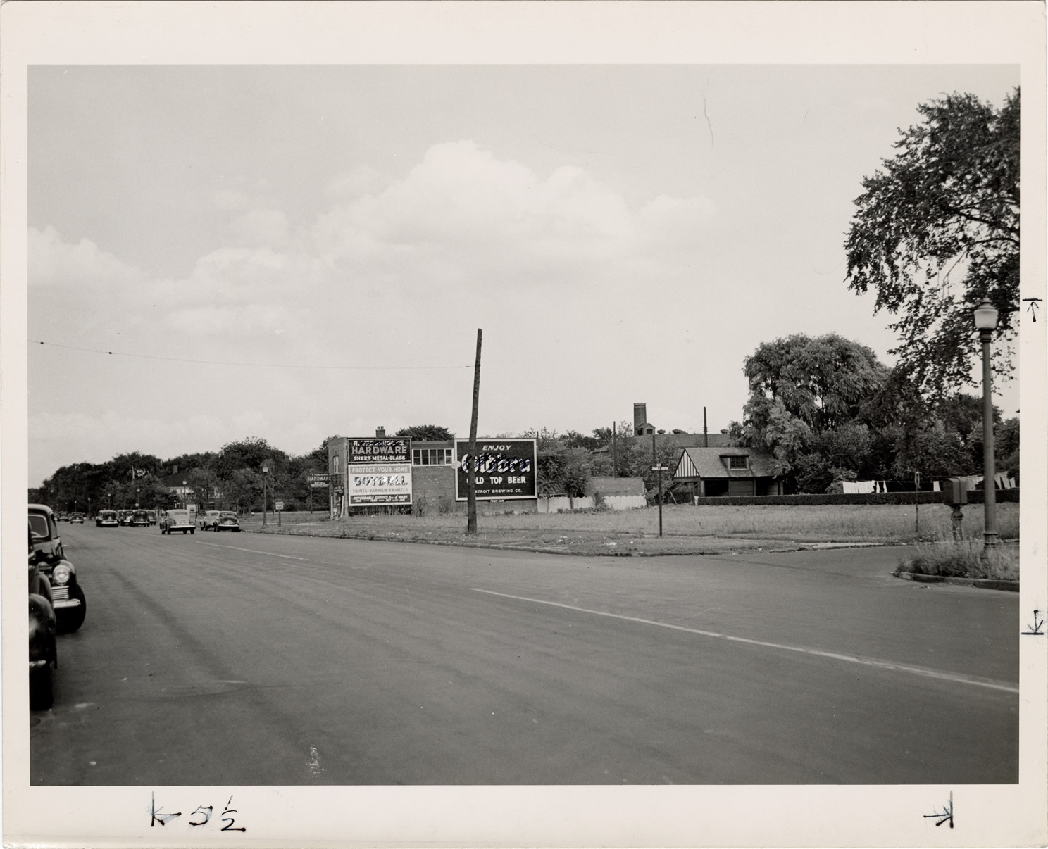 View of R. Verbrugghe hardware store on Mack near the corner of 3 Mile Dr. Stamped on back: "Detroit City Plan Commission. Photograph by Harold Raymond. No. BJ25." Handwritten on back: "Land use. Ribbon development. Mack & Three Mile Drive."