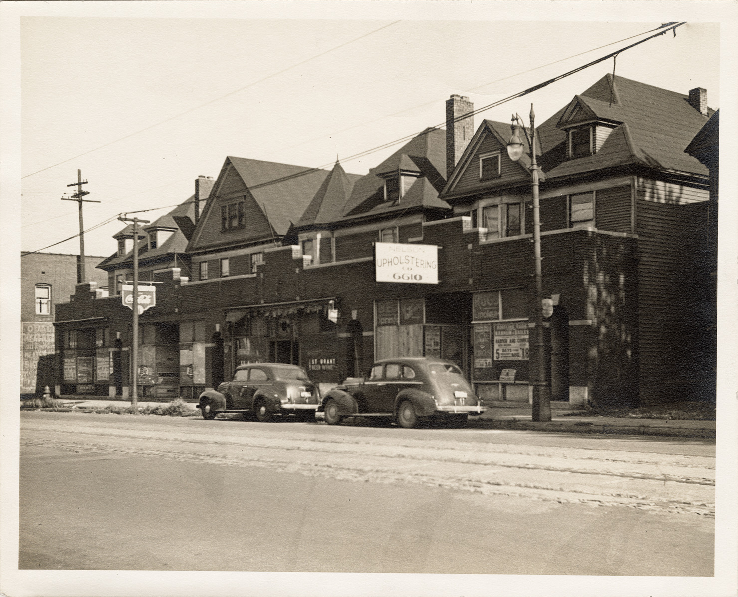 Favorite this☆ Storefronts on Kercheval Description: View of brick storefronts on wooden-frame buildings on Kercheval, east of Bellevue. Cars are parked in street. Sign on storefront reads: "Nelson Upholstery Co." Handwritten on back: "Commercial blight. S.S. Kercheval, E. of Bellevue. Raymond, 1943." Details Resource ID: bh020162 Creator: Raymond, Harold Subject: Storefronts--Michigan--Detroit Streets--Michigan--Detroit Automobiles--Michigan--Detroit Upholstery trade--Michigan--Detroit Detroit Housing Commission--Archives Photographic prints Date Issued: 1943 Format: 1 photographic print ; 8 x 10 in. Member of: Burton Historical Collection Filing Location: MS/Detroit Archives. Housing Commission. Commercial. 60:18 Rights: Physical rights are retained by DPL. Copyright is retained in accordance with U.S. copyright laws.
