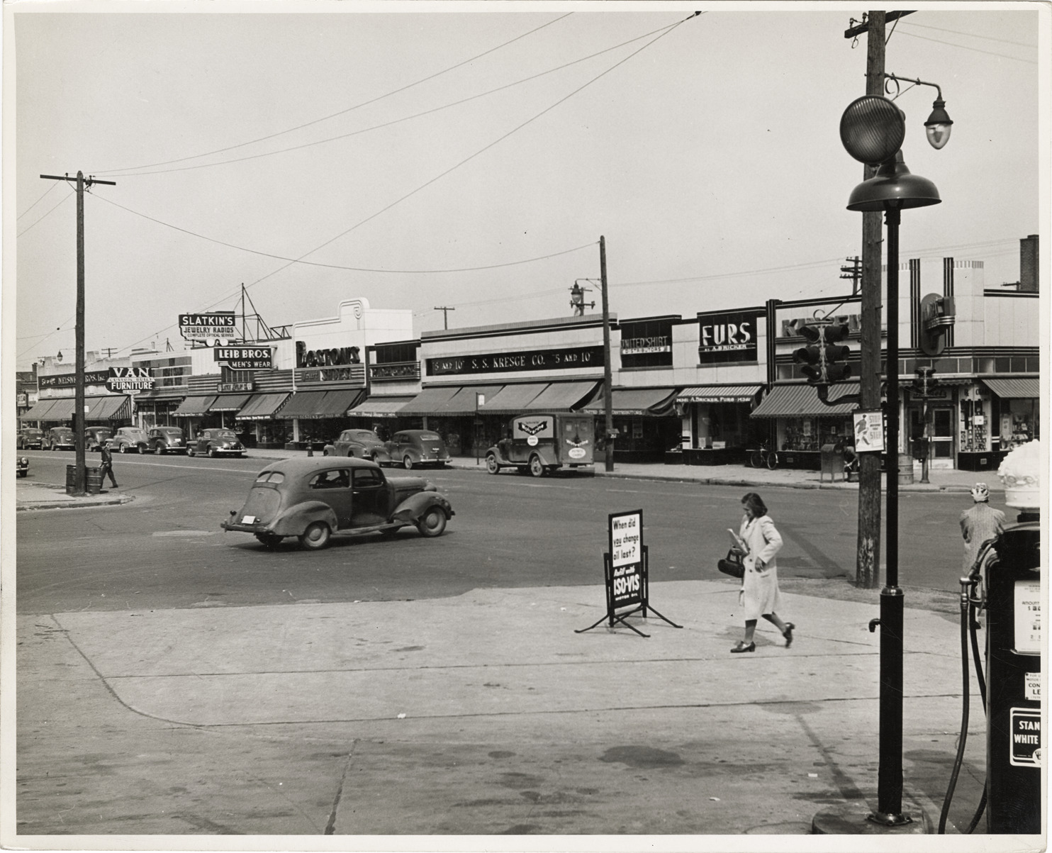 View of stores on Harper, west of Chalmers. Businesses include S.S. Kresge Co., Slatkin's, Leib Bros., Van Furniture and United Shirt. Car at intersection; woman walks on sidewalk in foreground. Handwritten on back: "Shopping center. N.S. Harper, W. of Chalmers. Raymond, 1944."