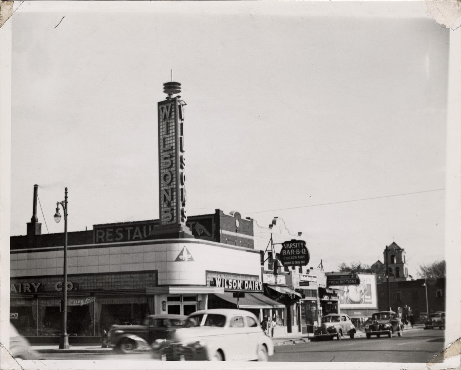 View of the Wilson Dairy Co. store and restaurant on the corner of an unidentified street. Sign for Varsity Bar-B-Q on building in background; cars in street.