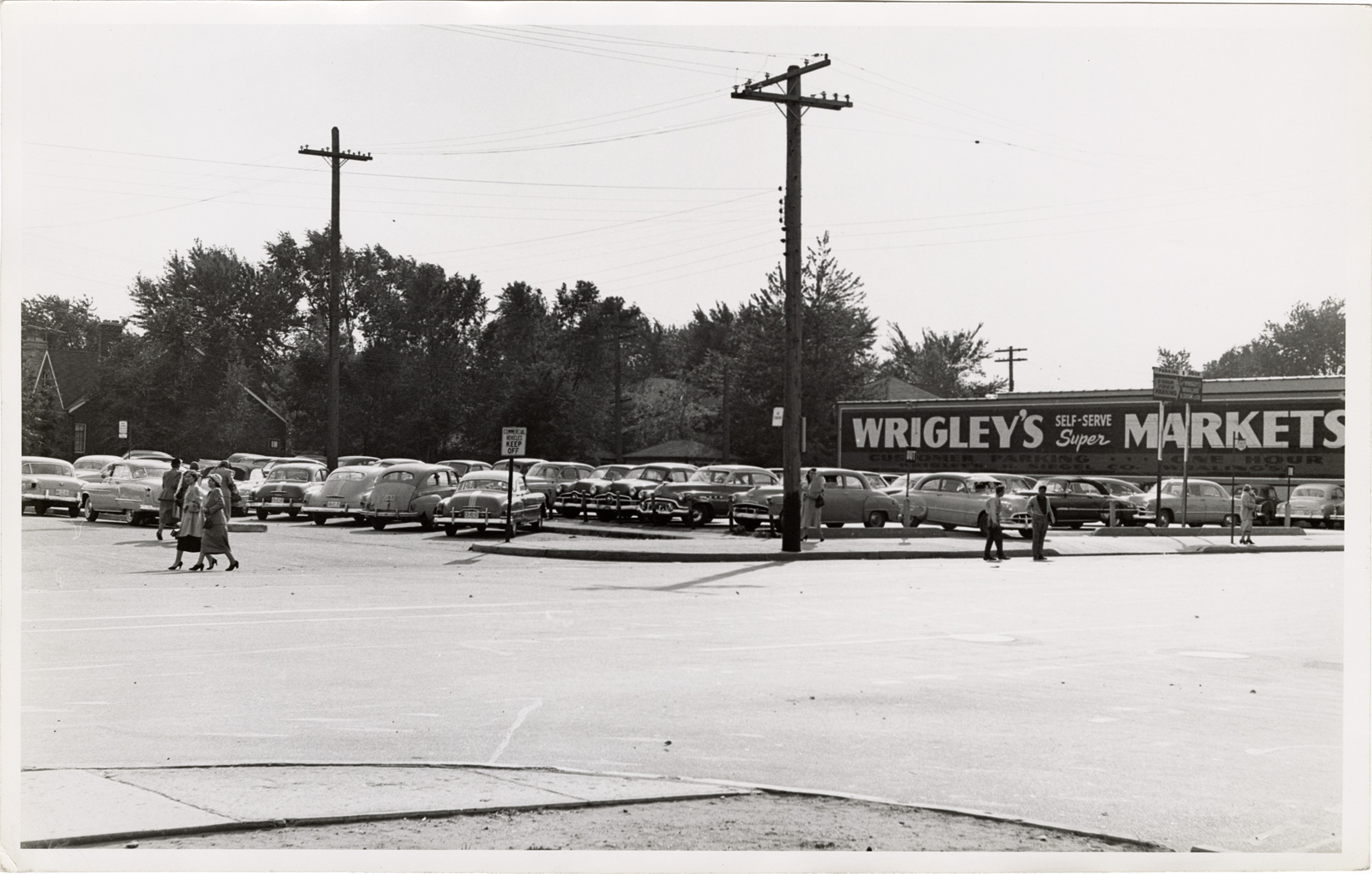 View of cars in parking lot on the southwest corner of Stoepel and 7 Mile Rd., adjacent to a Wrigley's supermarket. Stamped on back: "Harold Raymond." Handwritten on back: "Southwest corner of Stoepel & Seven Mile Road."