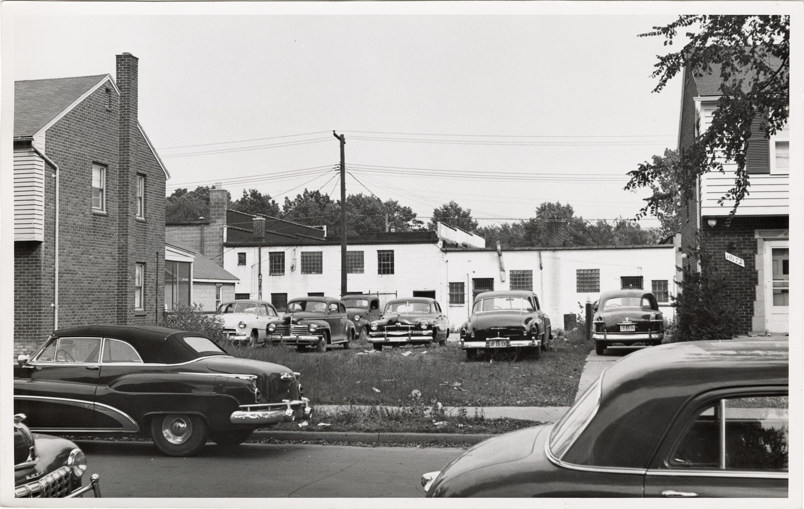 View of cars parked in a vacant lot on Stoepel. Buildings in background. Stamped on back: "Harold Raymond." Handwritten on back: "East side of Stoepel bet. Cambridge and Seven Mile Road. View looking east."