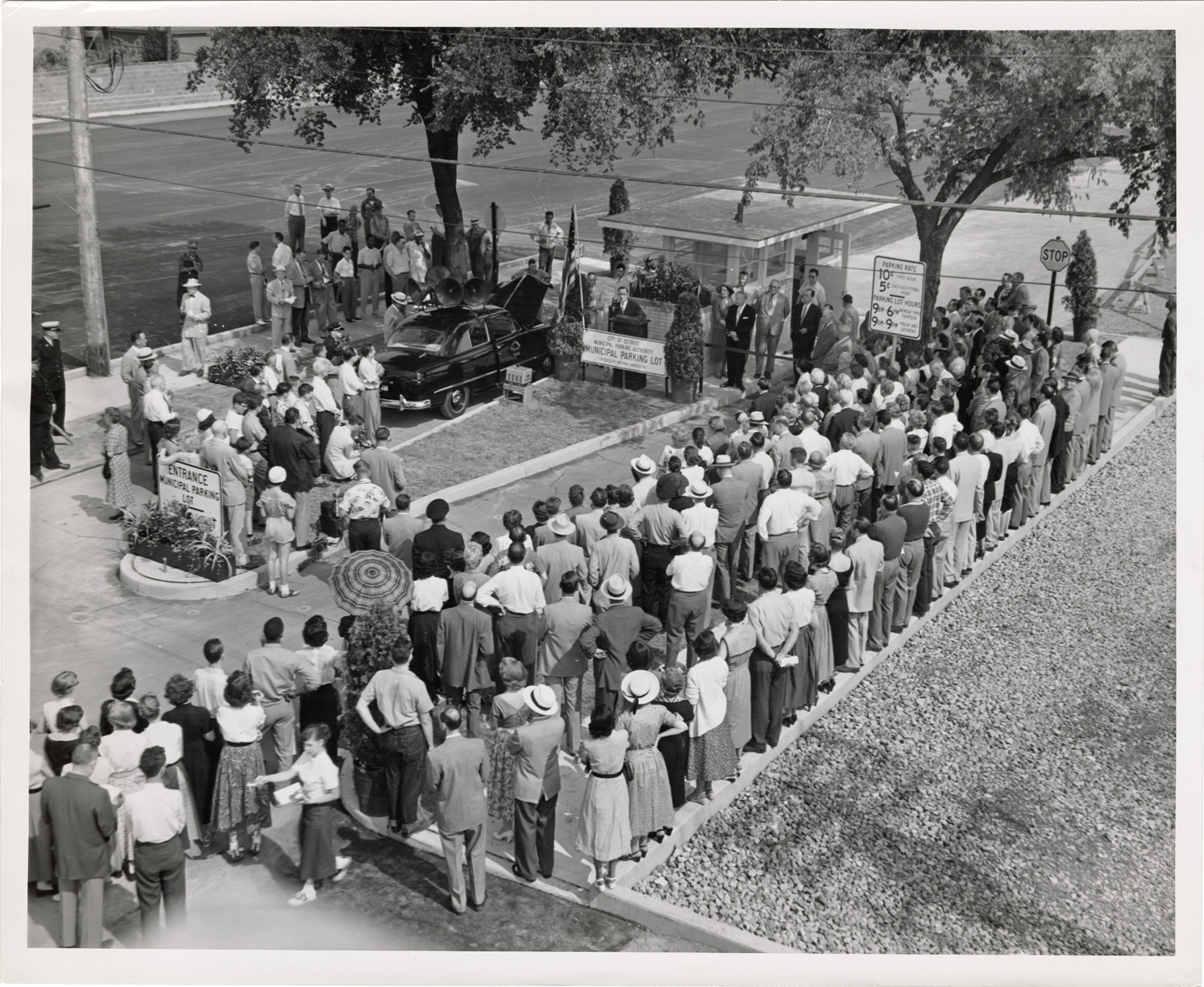 View of a small crowd gathered for a ceremony at the entrance to a Detroit municipal parking lot. Mayor Albert Cobo stands at podium; car with loudspeakers in background. Sign reads: "City of Detroit. Municipal Parking Authority. Municipal Parking Lot. Operated by National Garages, Inc."