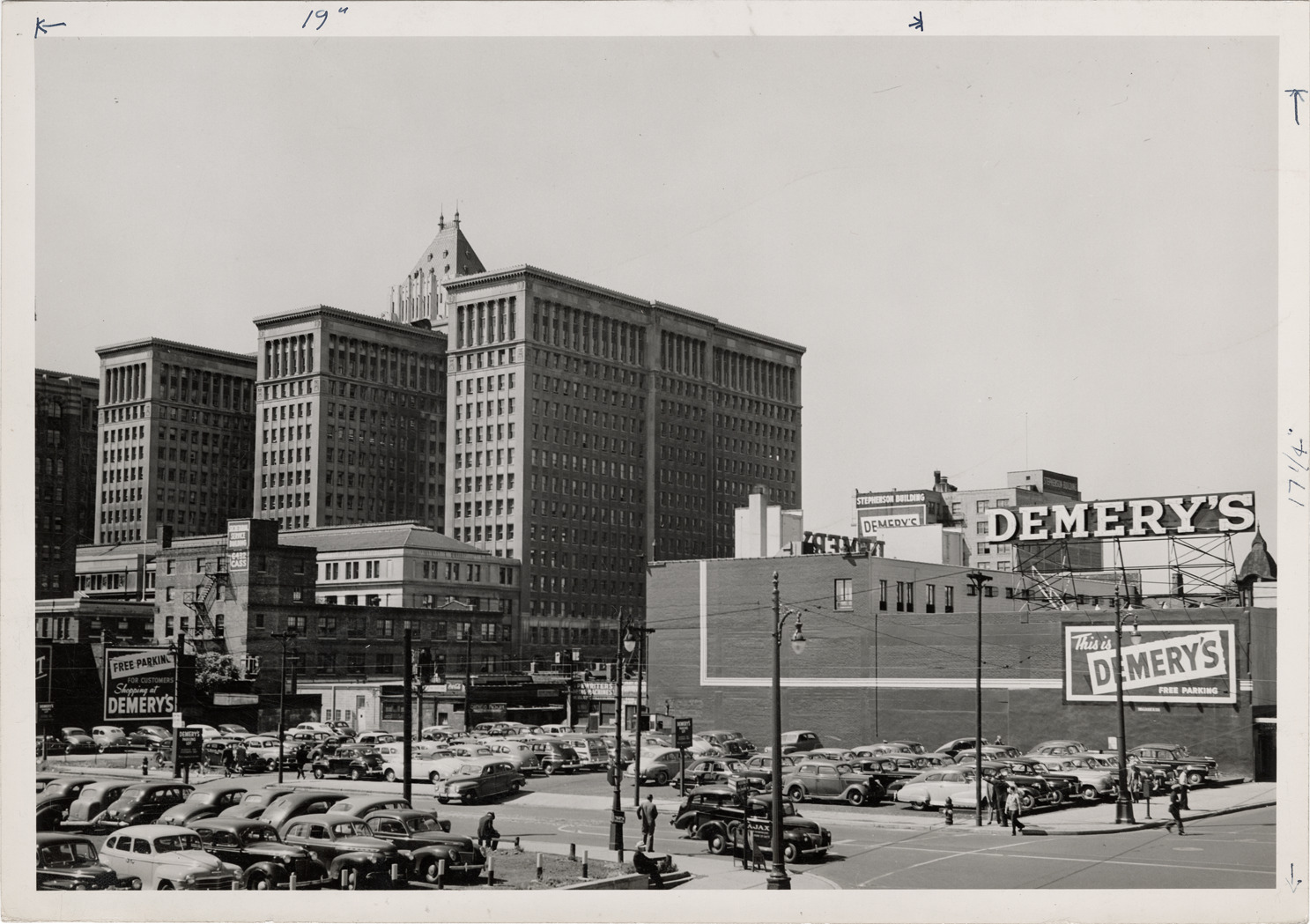 View of cars in parking lot behind Demery's department store. General Motor Building and Fisher Building in background. Stamped on back: "Detroit City Plan Commission. Photograph by Harold Raymond. No. BJ7." Handwritten on back: "Off street parking. Demery's parking lot at N.W. corner of Baltimore and Woodward. Also commerce. General Motors & Fisher Bldgs."