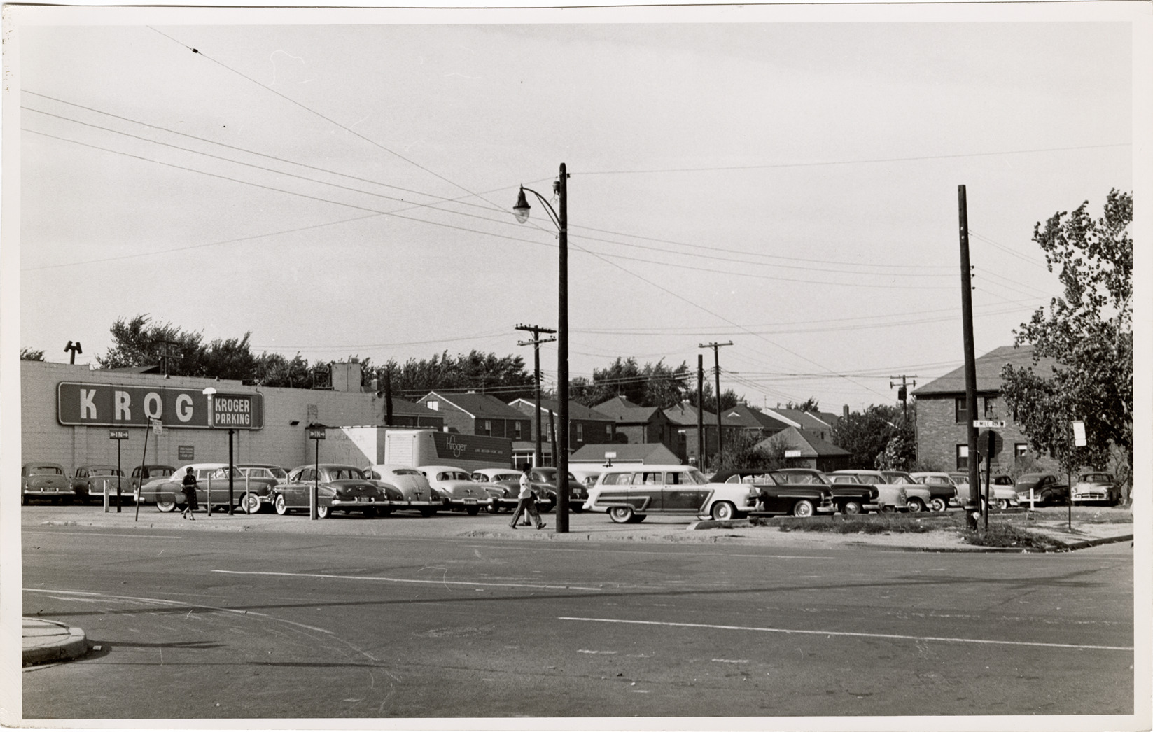 View of cars in parking lot on the northwest corner of Stoepel and 7 Mile Rd., adjacent to a Kroger supermarket. Stamped on back: "Harold Raymond." Handwritten on back: "Northwest corner of Stoepel and Seven Mile Rd."