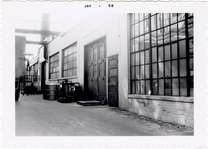 Close-up view of an unidentified brick factory building. Steel drums are next to doors. Printed on front: "Jan. 58."