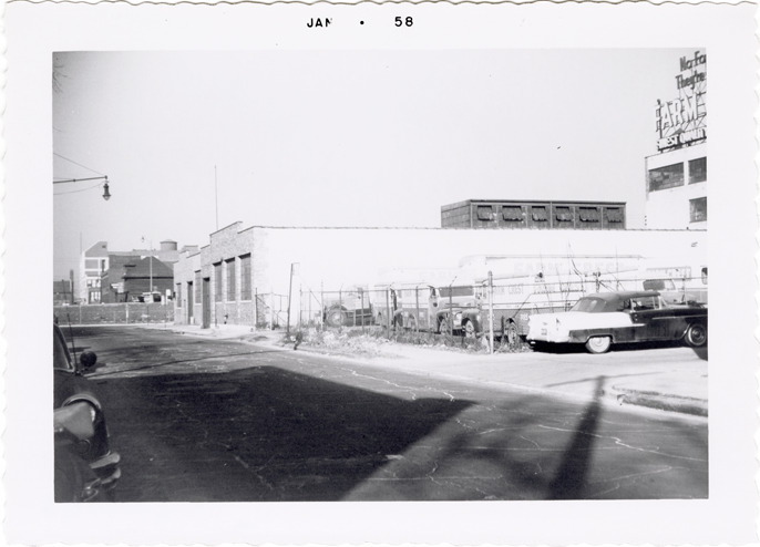 View of a one-story brick factory building, possibly part of Farm Crest Bakeries. Farm Crest delivery vans parked in adjacent lot. Printed on front: "Jan. 58."