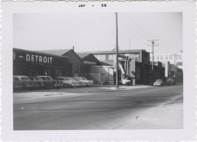 Favorite this☆ Newcomb-Detroit Co. factory Description: View of automobiles parked in front of the Newcomb-Detroit Co. factory, located at 5741 Russell. Sign on brick building reads: "Newcomb-Detroit." Printed on front: "Jan. 58." Details Resource ID: bh020241 Subject: Factories--Michigan--Detroit Paint industry and trade--Michigan--Detroit Detroit Housing Commission--Archives Photographic prints Date Issued: 1958-01 Format: 1 photographic print ; 3.25 x 4.5 in. Member of: Burton Historical Collection Filing Location: MS/Detroit Archives. Housing Commission. Milwaukee Junction Project #1. 61:29 Rights: Physical rights are retained by DPL. Copyright is retained in accordance with U.S. copyright laws.