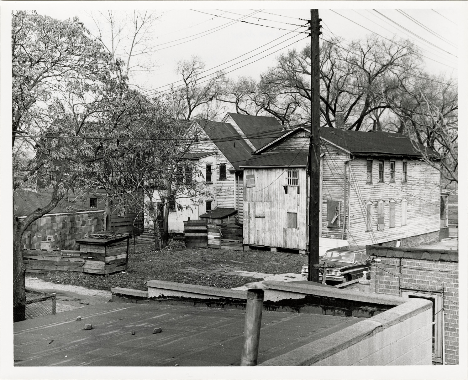 Rear view of two wooden-frame houses located at 925 W. Canfield, showing sheds and backyards. Stamped on back: "Taken Mar 28, 1966." Handwritten on back: "Calumet Rehab. Proj. Rear 925 W. Canfield looking N.W. All to be removed (Canfield widening)."