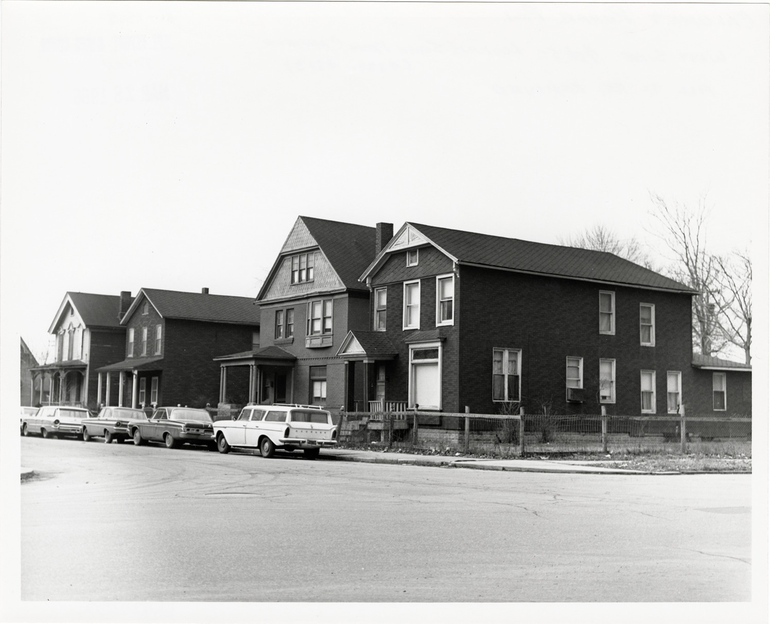 View of four houses located at 4313-4339 4th St. Houses are brick, wooden-frame and have simulated brick siding. Station wagon and cars parked in street. Stamped on back: "Taken Mar 28, 1966." Handwritten on back: "Calumet Rehab. Proj. West side 4th St. looking south from Canfield (4339-4313). All to be removed."