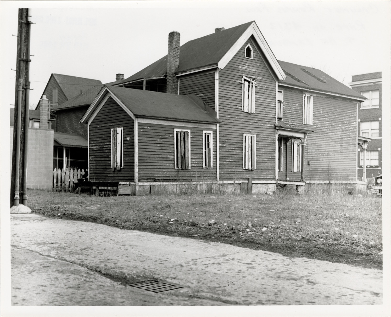 Favorite this☆ House at 4313 Fourth Street Description: Side and rear view of a two-story, wooden-frame house located at 4313 4th St. Stamped on back: "Taken Mar 28, 1966." Handwritten on back: "Calumet Rehab. Proj. Rear of 4313 4th St. All to be removed." Details Resource ID: bh020253 Subject: Wooden-frame houses--Michigan--Detroit Detroit Housing Commission--Archives Photographic prints Date Issued: 1966-03-28 Format: 1 photographic print ; 8 x 10 in. Member of: Burton Historical Collection Filing Location: MS/Detroit Archives. Housing Commission. Calumet Rehabilitation Project. 62:29 Rights: Physical rights are retained by DPL. Copyright is retained in accordance with U.S. copyright laws.
