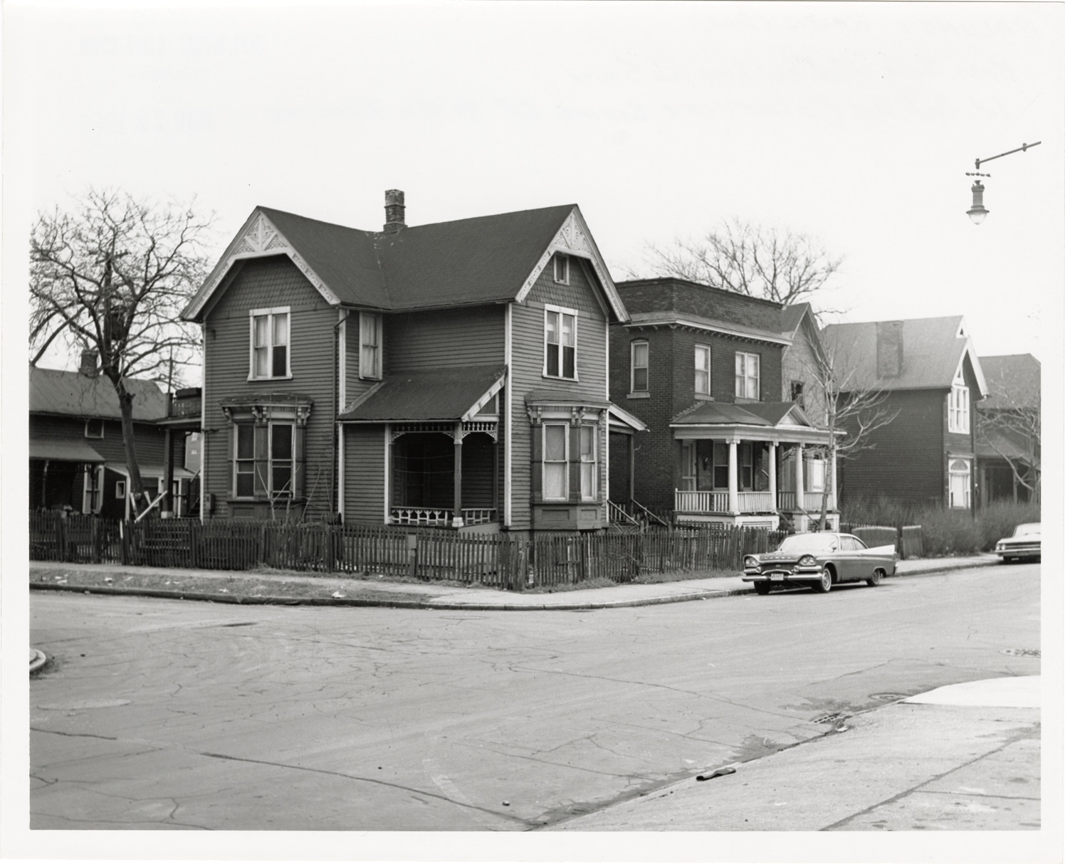 View of two wooden-frame houses, a brick house and a house with simulated brick siding located on 4th St. Car is parked in street. Stamped on back: "Taken Mar 28, 1966." Handwritten on back: "Calumet Rehab. Proj. East side 4th St. looking south. 1st, 3rd, 4th & structure behind 1st to be removed."