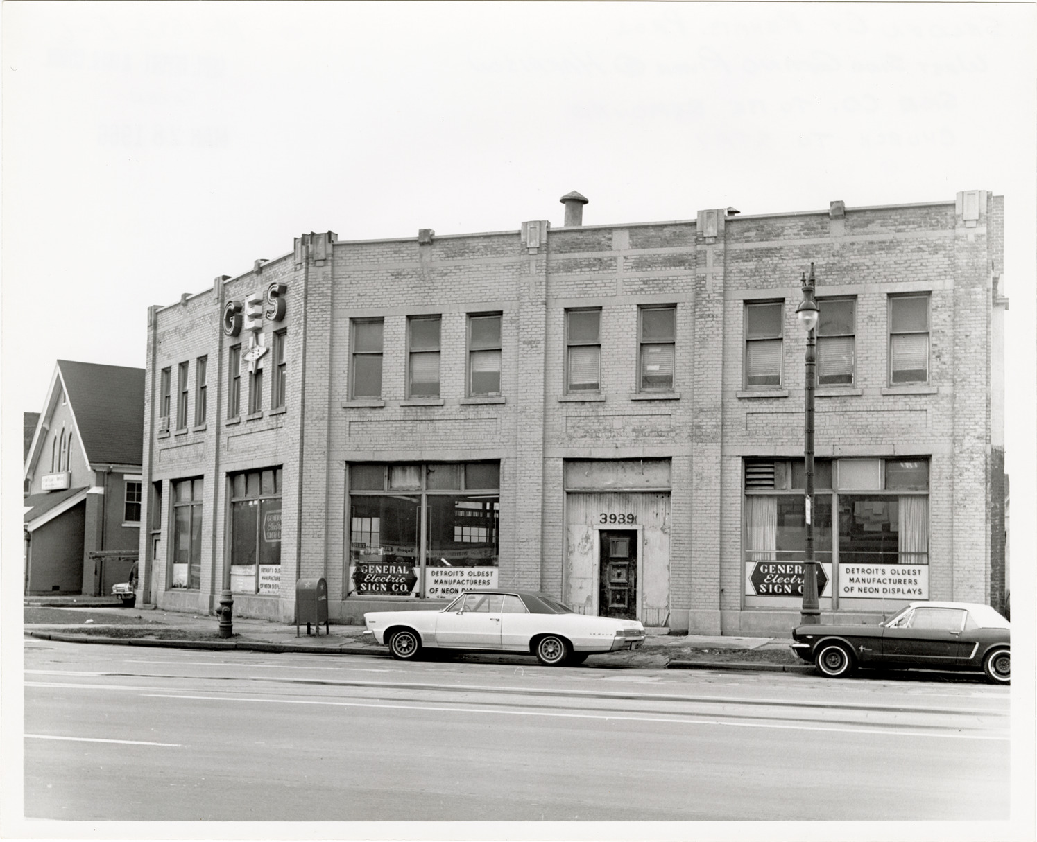View of the General Electric Sign Co. located at 3939 Grand River Ave. Sign in window reads: "Detroit's oldest manufacturers of neon displays." Cars are parked in street. Stamped on back: "Taken Mar 28, 1966." Handwritten on back: "Selden Ct. Rehab. Proj. West side Grand River @ Harrison. Sign Co. to be removed. Church to stay."